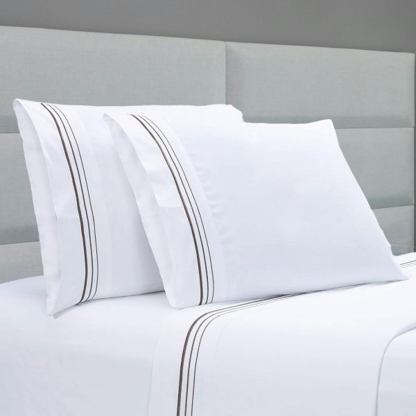 400 Thread Count White Cotton Sateen Hotel Stitch 3 Line Embroidery Border 4 Piece Sheet Set