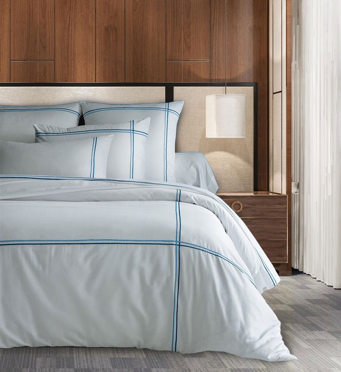 400 Thread Count White Cotton Sateen Hotel Stitch Duvet Cover Set in Double Embroidery Border 1 Duvet Cover and 2 Pillow Sham Cover